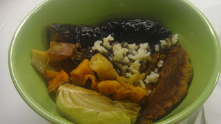 Roasted vegetables will last for over a week in the fridge. I know ‘cuz I’m eating them for lunch. Roasted fennel, butternut squash, potatoes, carrots, celery, eggplant, mushroom; much of what went into last weeks Iron Chef stuffed potatoes. Throw in some brown & wild rice, and a chickpea cutlet (what doesn’t go with chickpea cutlet) and I’ve got a pretty satisfying lunch in a bowl. Way better than any prepared meal from the freezer section.