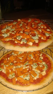 Roll out dough. If you’ve got a pizza stone, put a little cornmeal on the pizza peal so it slides off onto the stone easily. Otherwise, put a little cornmeal on a baking sheet or pizza pan and spread the dough out. Top with sauce, crumbled blue sheese, plop on dollops of tofu basil, add chix pieces. Space around so that each bite will have a little of each topping. Put in preheated oven and bake about 10 min.