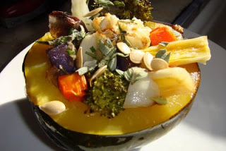 Simple preparation, I roasted the veggies on a baking sheet and popped them in the squash half. Topped with toasted squash seeds, rosemary, oregano, sage and warmed in the oven.