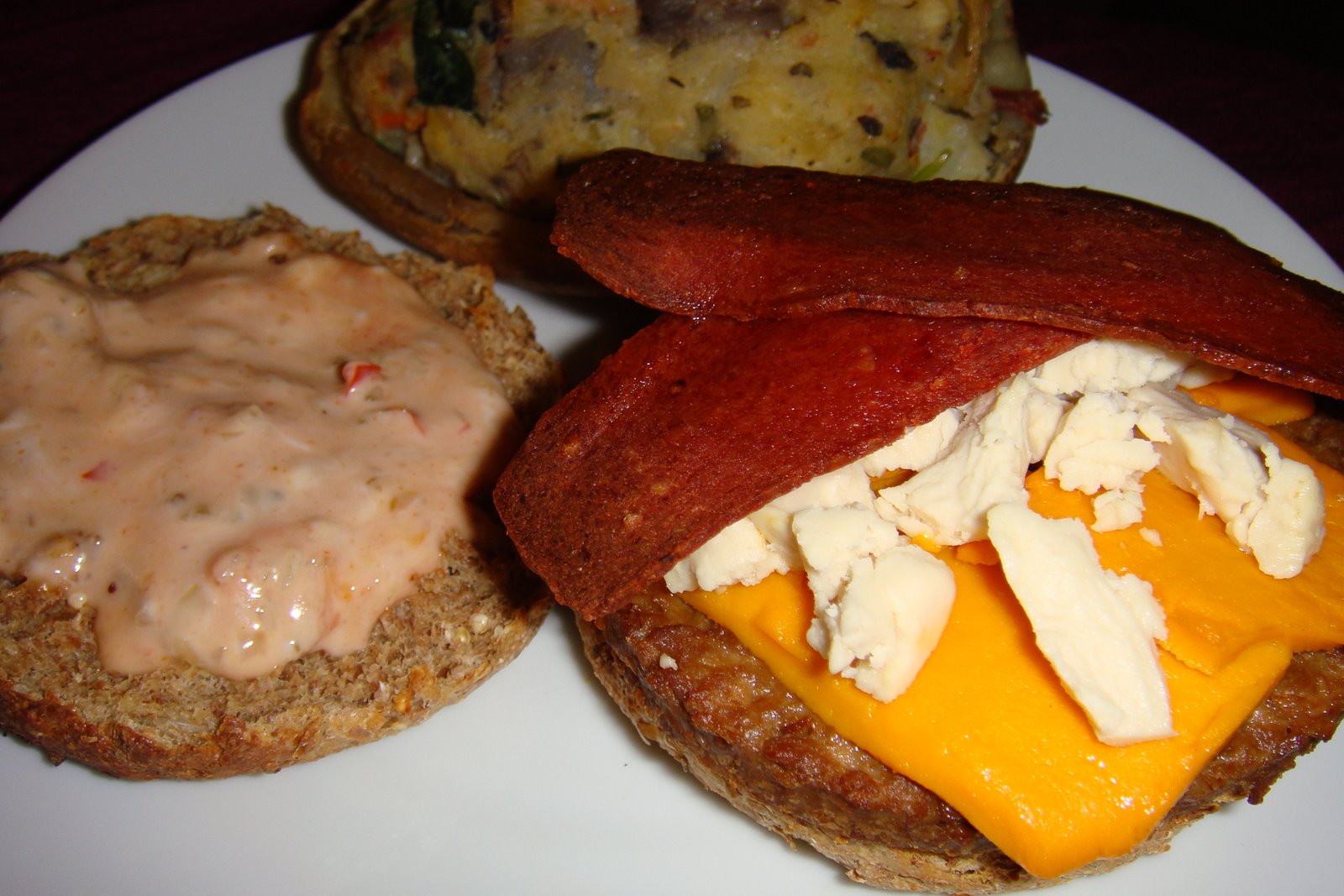 Maybe I’m just hungry, but this is the best vegan burger I have ever had. It’s not the individual parts, but rather the whole that has just made my night. In the immortal words of U2 it is even better than the real thing. I don’t usually power down an pile of relatively processed faux products, but this bad boy really hit the spot. There’s a veggie stuffed potato in the background to redeem myself. I don’t think it’s doing much. I wish I’d made fries.