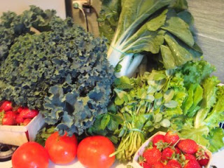 And as a healthy balance to my cake for breakfast, here’s the bounty from my first CSA share. The tomatoes were from the greenhouse. I cooked the GIANT bunch of kale, and it went into things like scrambles and soups. I’m still not sure what the heck I’m going to do with all the bok choy. The purslane was nice in a salad.