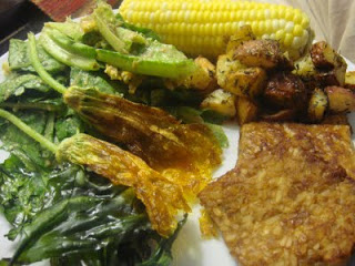 I got romaine lettuce, from the CSA which was way greener than the usual translucent romaine you find in the grocery stores, so I tried to make a Cesar dressing. I used the one from the uncheese cookbook, but it was not very Cesar like (nooch, tahini, mustard.) I added some almonds from the vcon recipe which helped. Then I dumped in a bunch of seaweed flakes. In the end it was just OK. I threw some squash blossoms in the salad, too just because they’re so pretty. Corn from the CSA. The tempeh was a last minute add on. I sprayed it with braggs liquid aminos, then fried it in the olive oil from the blossoms. Not much on flavor, but if you take a bit of tempeh with a bite of potato, it is a nice balance.