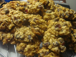 In a separate large bowl mix together the oil, sugars, applesauce, soymilk, and vanilla. When well blended add the flour mixture and blend together. Add the oats, and mix, add the choc chips, walnuts, raisins, and cranberries, and mix together after each addition.
