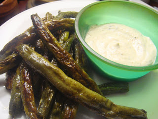 I got some giant end of the season green beans from my CSA. So I oven fried them with a good bit of olive oil and ate them with a side of ranch dressing.