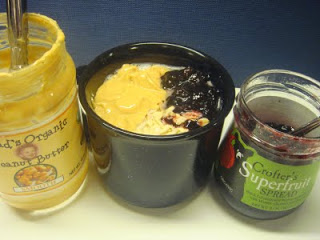I usually make oatmeal at work for breakfast with some rolled oats and raisins, but I ate all the raisins yesterday and forgot to bring more in. I did have some peanut butter left at the bottom of the jar and I had some Crofter’s superfruit spread in the fridge. It’s the Europe blend with black currants, pomegranates, morello cherries and red grapes.