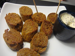This is my first go at the seitan-in-foil sausage technique. The recipe is from Alicia Simpson’s Quick and Easy Vegan Comfort Food. You know how I love the field roast and tofurky sausages, but this is so easy I might just have to start making my own more often. Not sure these will fool the ninja, but I’ll have to try it out in something. They are decidedly breakfast sausage flavored, but would go well as an appetiser with mustard sauce. This is how I ate them for actual breakfast (it’s 10AM) because I didn’t have any tofu to make a scramble to go with them. Anyway they were really good this way. Eating with toothpicks is so sophisticated. I sliced the steamed sausages and then pan fried them in a little oil. The mustard sauce is just some whole grain mustard and vegenaise. Here’s the sausages after they have steamed in foil.