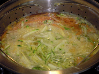 Optional: I used the strainer that goes in the pasta pot to blanch the veggies. You can leave them raw if you like, but I wanted them to kind of melt in with the sauce. I put the strainer in the pasta water pot with the veggies for about 2 minutes then took it out and ran them under cold water to stop the cooking and chill.
