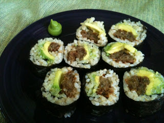 Updated with cutlet and avocado maki. I couldn’t find the bamboo roller, so here’s proof that you can use parchment paper in a pinch. A clean dishtowel works, too.