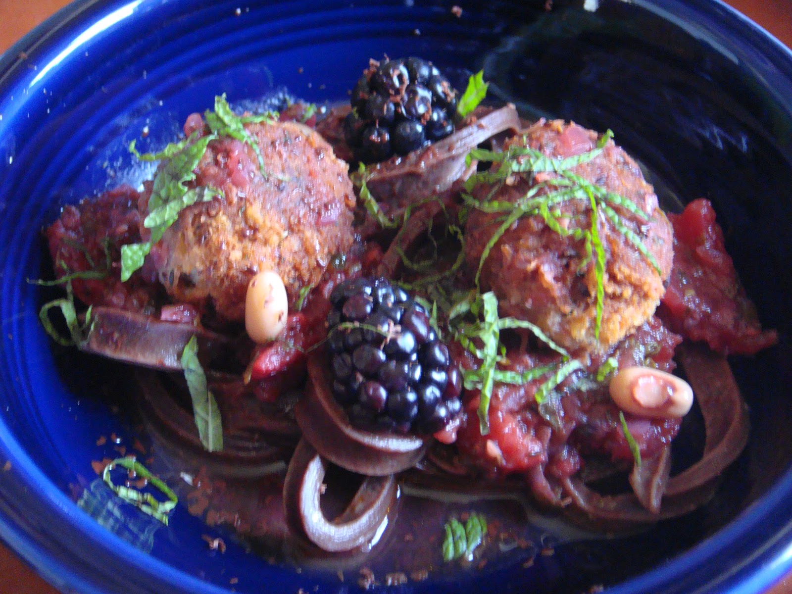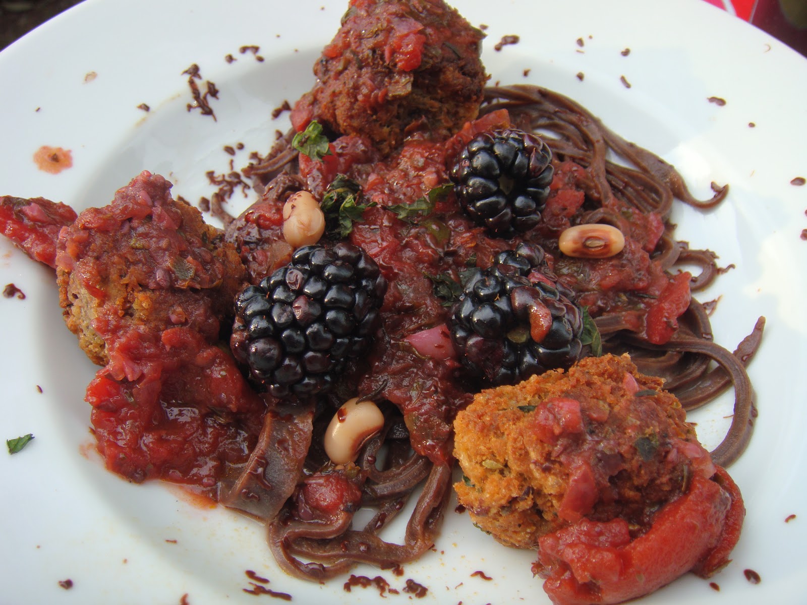 12 thoughts on “Vegan Chopped – Black Celebration Pasta: Black linguine with black-eyed pea balls with blackberry Marinara