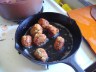 Black-Eyed Pea balls:  Heat vegetable oil in cast iron fry pan.  Blend black-eyed peas, olive oil, salt, water, fresh herbs, and dried herbs.  In medium bowl, mix together wheat gluten and breadcrumbs.  Add black-eyed pea mixture and mix together with your hands to form dough.  Knead a little.  Break into just smaller than golfball sized pieces and shape into a ball. Fry until golden brown.   Tip: If you slightly flatten 6 sides to kind of make a square with them, they’ll be easier to get brown on all sides.