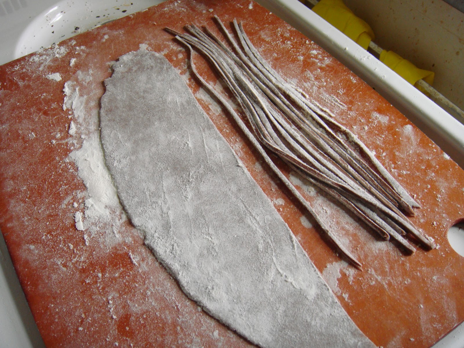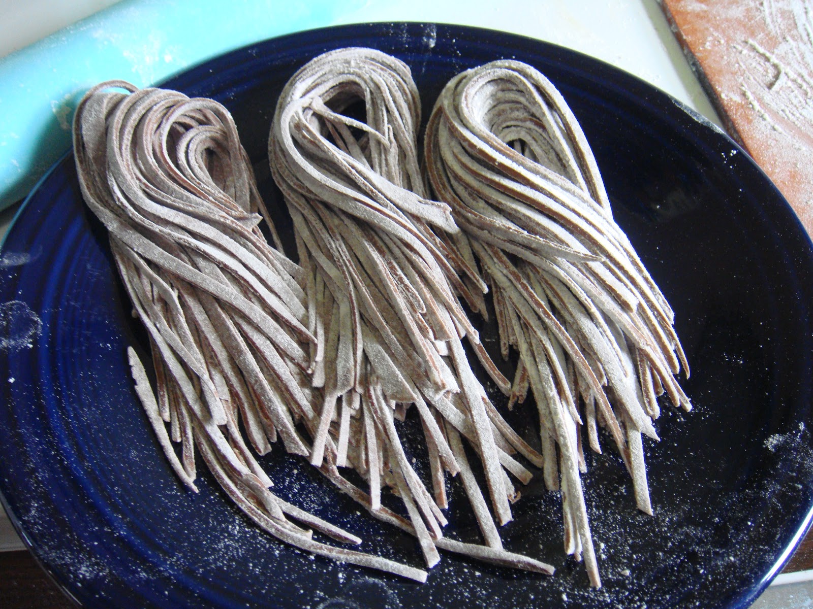 Linguini part 1: Mix together flour, melted chocolate***, and water.  Add additional water/flour as needed to form smooth ball.  Knead for a few minutes or throw into bread machine/mixer/food processor for a quick knead.  Wrap in wax paper or plastic and set aside.