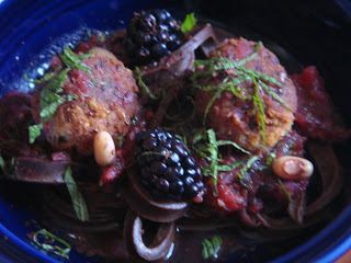 Black Celebration pasta garnished with challenge ingredients:  Blackberries, black-eyed peas, mint chiffonade, and chocolate shavings.
