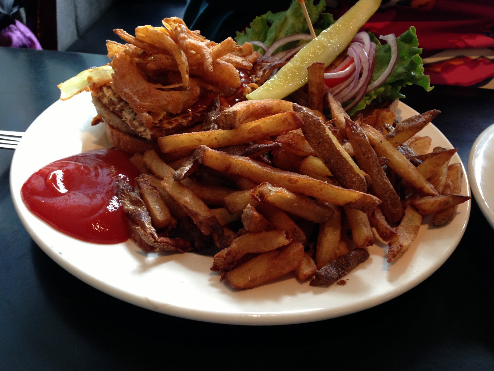 Jodi had one of the fancy burgers that was topped with crispy onions – that she loved, something bacony, and bbq sauce.