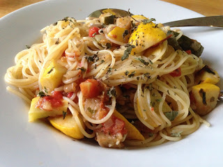 Cappellini pasta pairs perfectly with summer veggies. Mostly CSA haul: Japanese eggplant, yellow and green pattypan squash, onions, garlic, heirloom tomatoes, basil, olive oil, vegetable paste, and lots of oregano!