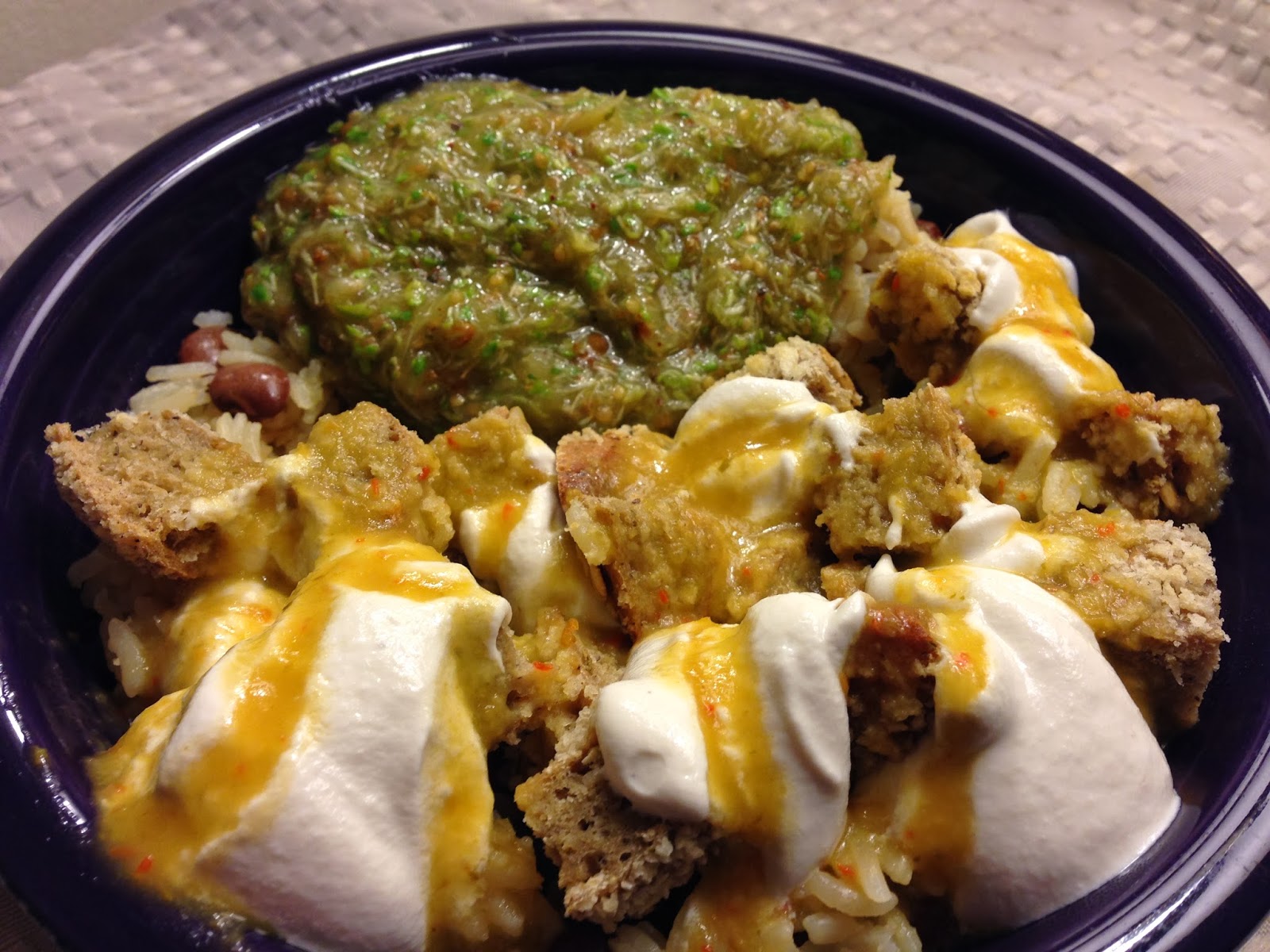 Not really a recipe, but I started out with half an onion, about a cup of tomatillos in their juice, salt, a little ancho chile powder, a pinch of oregano, and some lemon juice and blended it up on low (you want it mixed, but don’t want to crush the seeds.) This was OK, but lacked freshness. So that’s when I stuck in the sprouts (about 2 cups) and gave it another whirl. The sprouts added exactly what I wanted – a fresh clean taste. Sure if I could keep cilantro alive, I probably would have used that instead, but I just got a whole dose of fresh sprouts in my dinner and I’m pretty psyched about it. It’s technically raw if I didn’t plop on top of a rice and bean setian cutlet bowl…