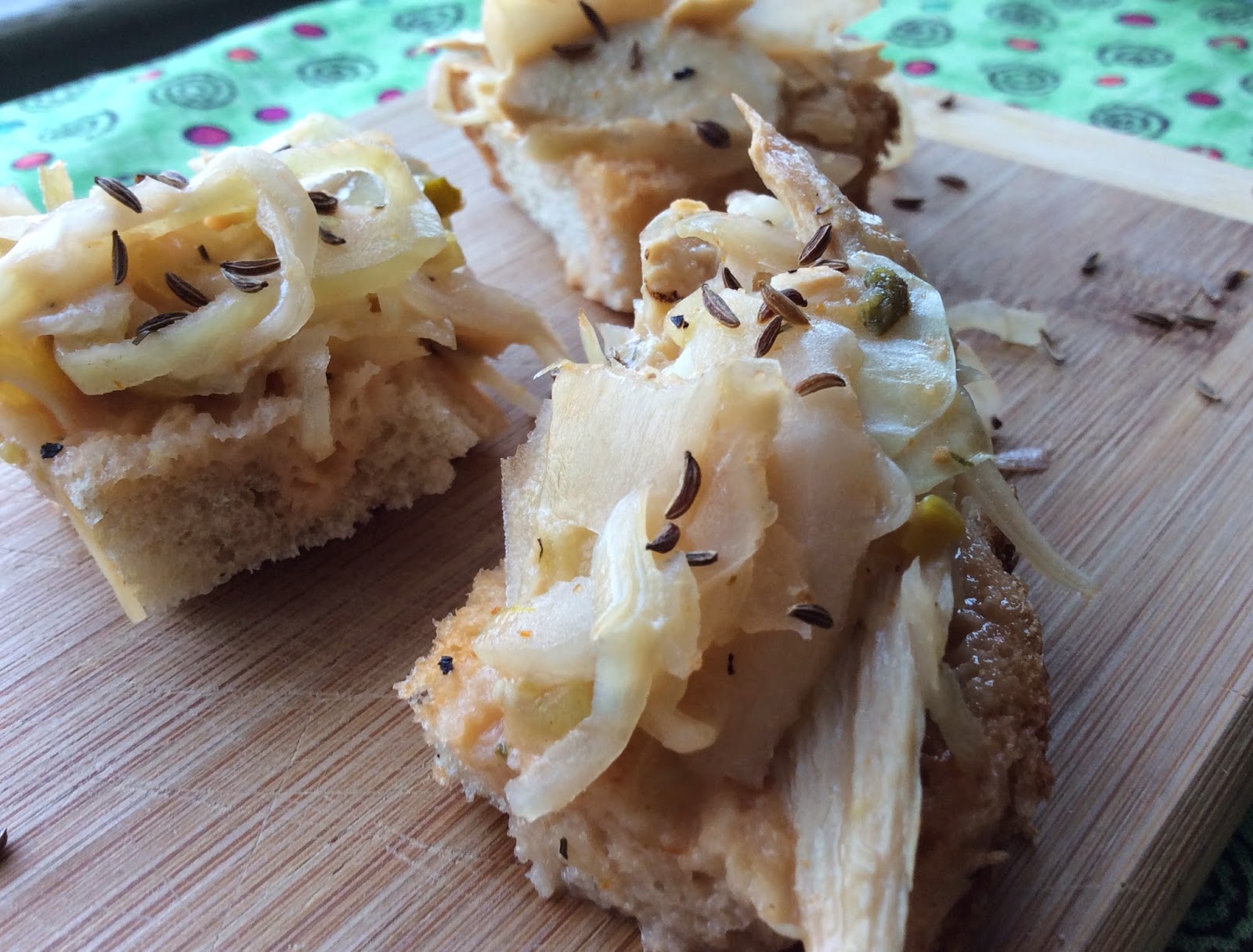I made these into bites because the crusty french bread I used always tears the crap out of the roof of my mouth if toasted on the top, so I opted for open faced and bite sized.