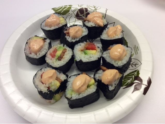 Here’s my iron chef sushi submission. Weirdly it’s the tomato that’s the oddball ingredient as the bacon is tempeh, and avocado (swapped for the lettuce) is a fairly normal American sushi roll ingredient.