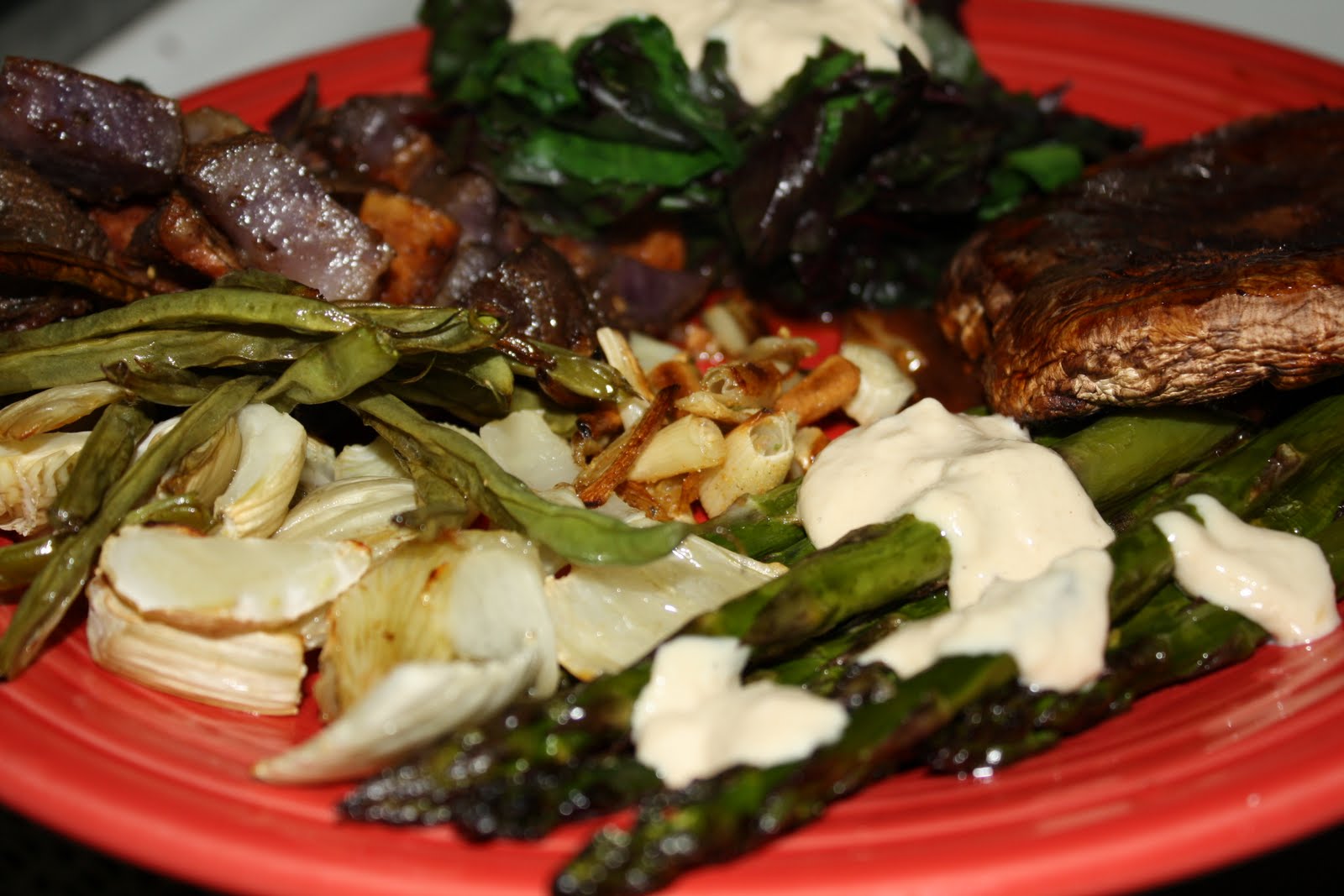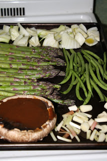 Roasting with the bits of ramp are asparagus, fennel, green beans, and a portabella schroom.