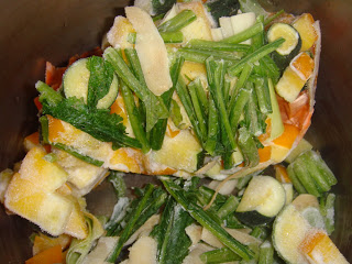 Here’s the vegetables straight from the freezer. Onion, carrot peelings, celery parts, the stems from turnip greens, some summer squash and the peel from a winter squash, and the greens from some leeks.